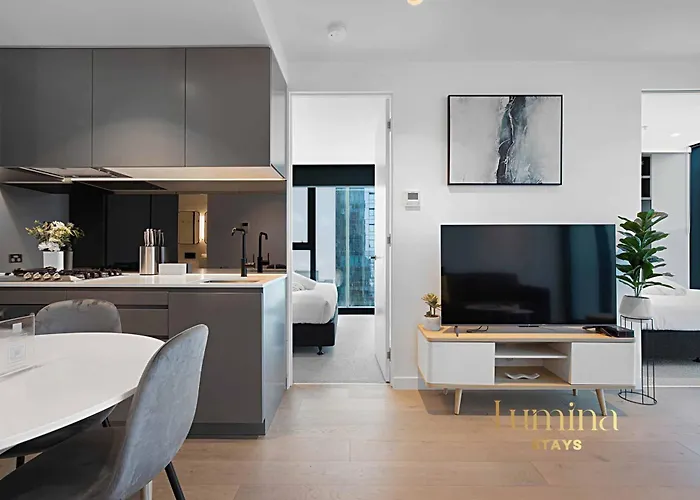 El apartamento Lumina Stays - Victoria One Melburne está situado a unos 15 minutos a pie del Teatro de Su Majestad, y a tan solo 1 km del Río Yarra. Este apartamento acoge a los huéspedes con una piscina cubierta y se encuentra al alcance de la Biblioteca Estatal de Victoria.